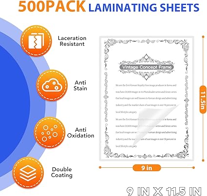 - Laminating Pouches Dimensions: 500PACK , 9″ x 11.5″, thickness: 3 Mil
